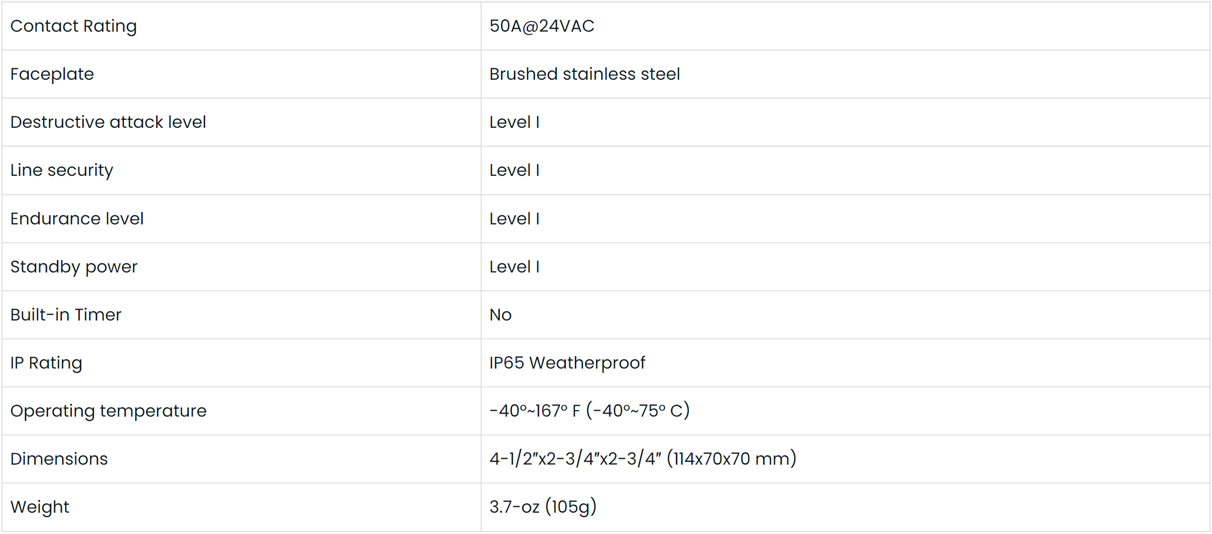The ENFORCER Weather-Resistant Mushroom-Cap RTE Plates are ideal for many outdoor access situations, with a 1-1/2″ (38mm) diameter mushroom-cap (green or red), single-gang faceplate and NO/NC contact rated 50A@24VAC.