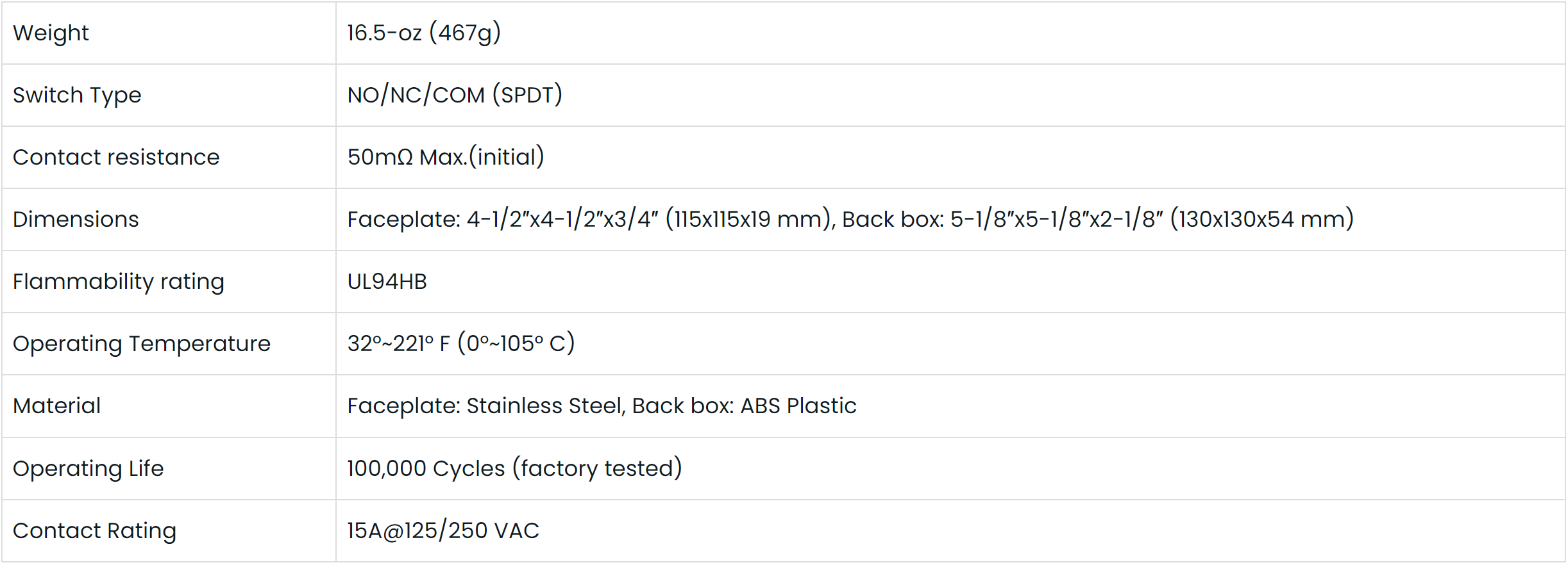 • Operating life: Over 100,000 cycles (factory tested)