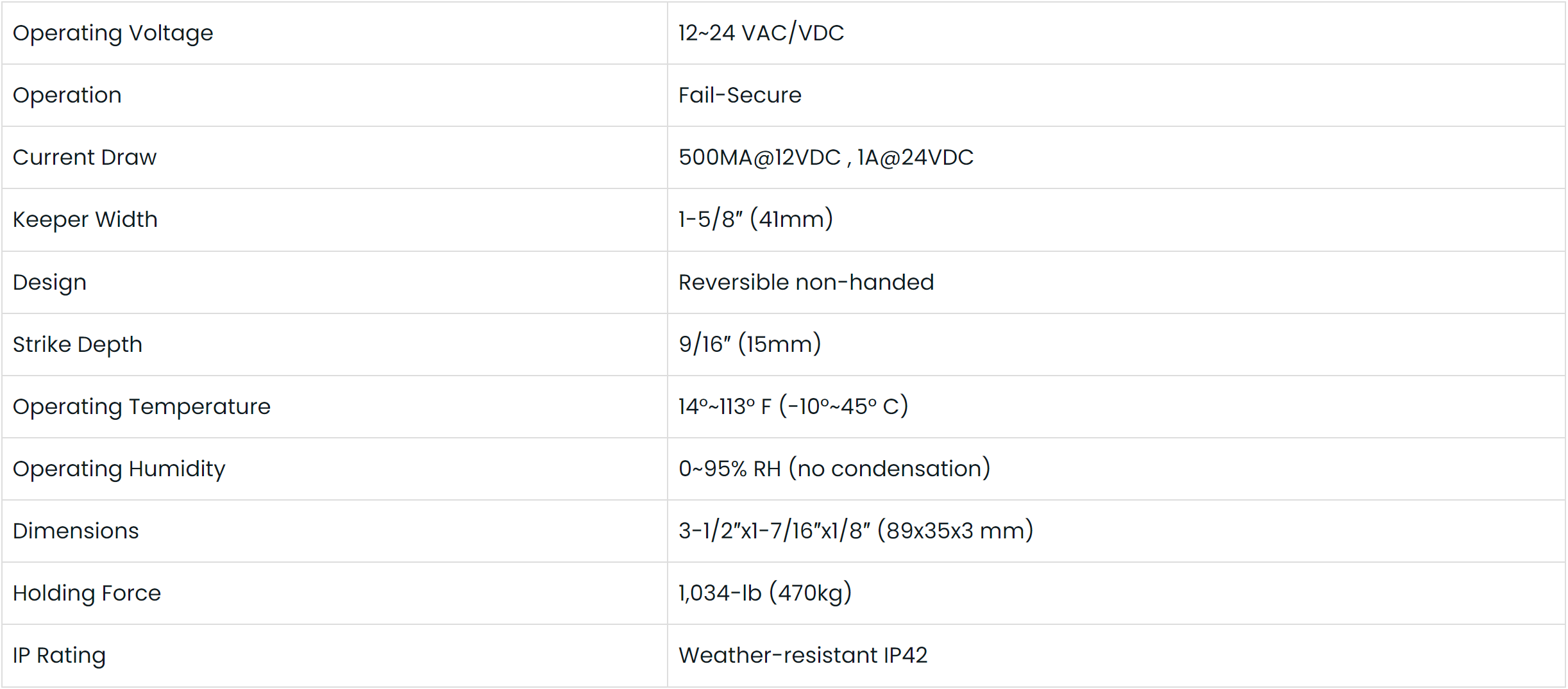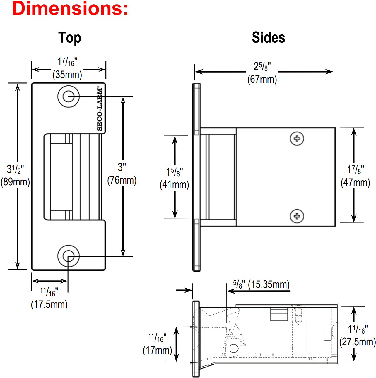 The Seco-Larm SD-995A-D3Q Weatherproof Door/Gate Strike has a unique design that accommodates both wood and metal doors. Its design also allows for reversibility from right or left-handed doors. It has a Zinc allow body with a corrosion resistant case as well as various moving parts. Its operating voltage is 12~24 VAC/VDC with a current draw of 500mA@12VDC, 1A@24VDC. The holding force of the strike is 1,034-lb (470kg) and it has been tested to last 250,000 cycles. It is equipped with a Fail-secure operation that allows the door to stay looked if power is lost. The strike depth is 9/16" (15mm) with a faceplate size of 31/2"x17/16"x1/8" (89x35x3 mm). It comes with the complete mounting hardware included.