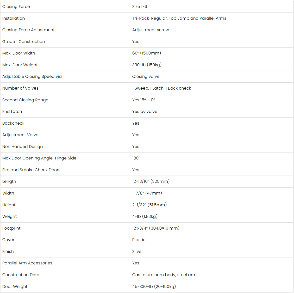 The Seco-Larm SD-C101-SBAQ Heavy Duty Door Closer is meant for commercial use. It has a cast aluminum body and a steel arm with a silver finish and a decorative plastic cover. It has adjustable sweep and latch speed, back check, and spring force (1~6). Can be switched between left and right handed as it comes with a non-handed installation. The closer has been tested to ANSI 156.4 (2 million life cycles). The door user with the Seco-Larm SD-C101-SBAQ Heavy Duty Door Closer should have a width of 32”~60” (800~1500mm) and a weight of 45~330-lb (20~150kg). The parallel arm brackets are included.