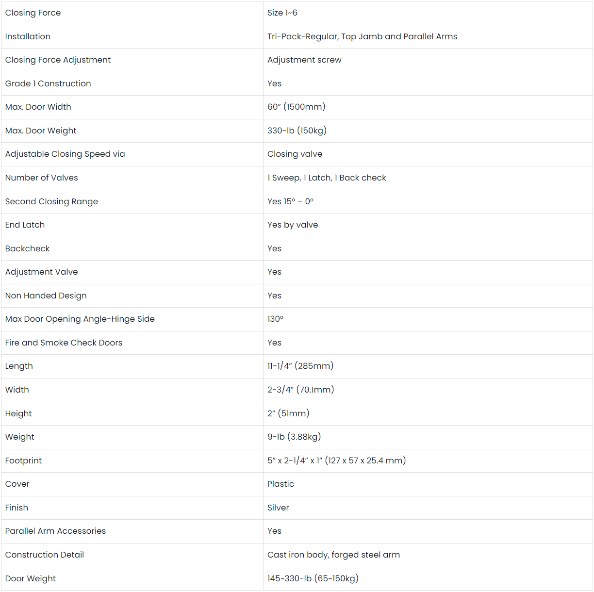 The Seco-Larm SD-C101-SBAQ Heavy Duty Door Closer is meant for commercial use. It has a cast iron body and a forged steel arm with a silver finish and a decorative plastic cover. It has adjustable sweep and latch speed, back check, and spring force (1~6). Can be switched between left and right handed as it comes with a non-handed installation. The closer has been tested to ANSI 156.4 (2 million life cycles). The door user with the Seco-Larm SD-C101-SBAQ Heavy Duty Door Closer should have a width of 32”~60” (800~1500mm) and a weight of 145~330-lb (20~150kg). The parallel arm brackets are included.