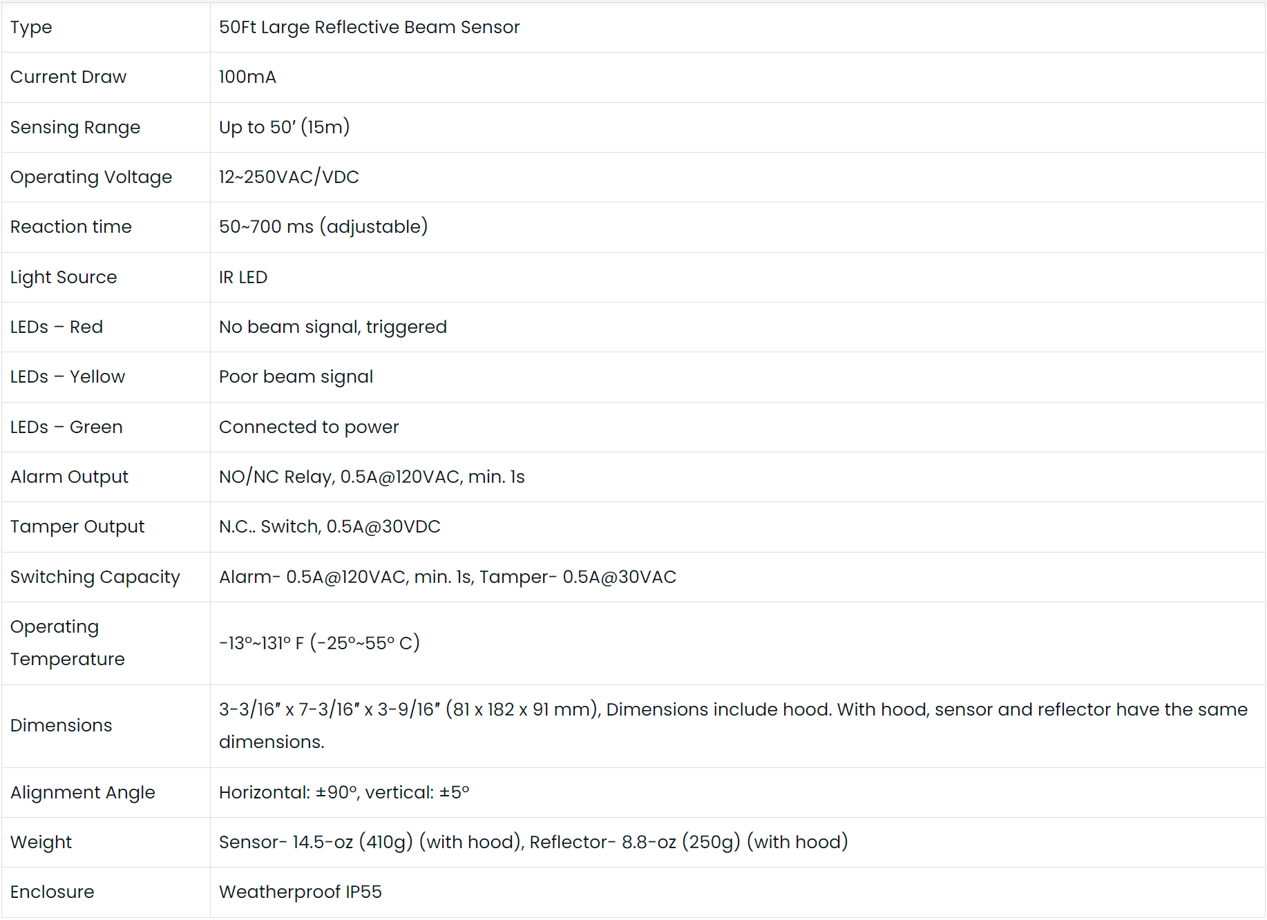The Seco-Larm SEA E-931-S50RRLQ Reflective Photo Beam is designed for industrial automation to detect objects on manufacturing line. It can also be used for garage doors, outdoor gates, and overhead doors. It comes with a IP66 Waterproof rating, sunlight-filtering case, and adjustable response time from 50~700 ms that allows it to be used indoors or outdoors. It also comes with a sensing range up to 50ft (15m). It has a large sensor with a patented design and a large reflector for a broad sensing area and easier alignment. Additionally, a reflective beam provides reliable perimeter security, minimizing false alarms from falling leaves, birds, etc. Furthermore, it comes with lensed optics that reinforce beam strength and provide excellent immunity to false alarms due to rain, snow, mist, etc. It has a NO/NC alarm output and operating voltage of 12~250 VAC/VDC. It includes a large reflector, hoods for sensor and reflector, and mounting hardware.