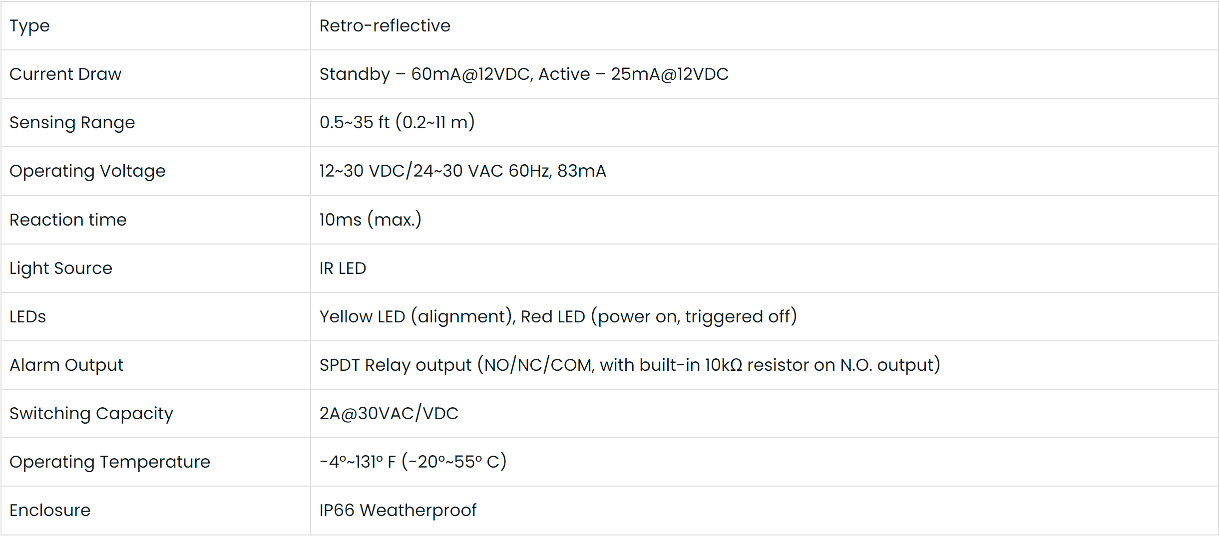 The Seco-Larm E-936-S35RRGQ Reflective Photoelectric Beam Sensor is meant for use with garage doors and outdoor gates. May be used for detecting entrances in places such as stores. It is also able to assist in the measuring of parking distances.