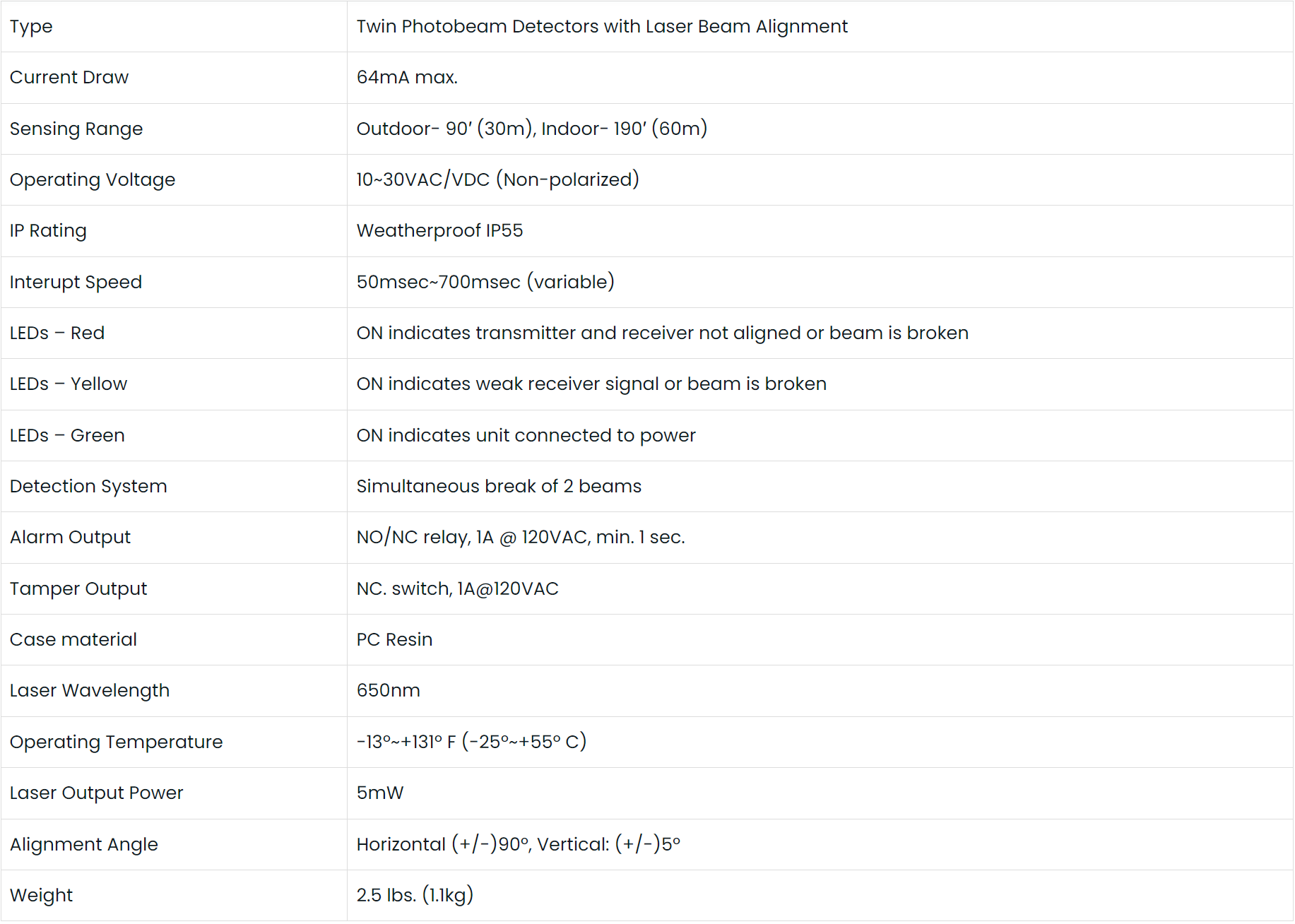 - Twin infrared beams provide reliable perimeter security, minimizing false alarms from falling leaves, birds, etc.