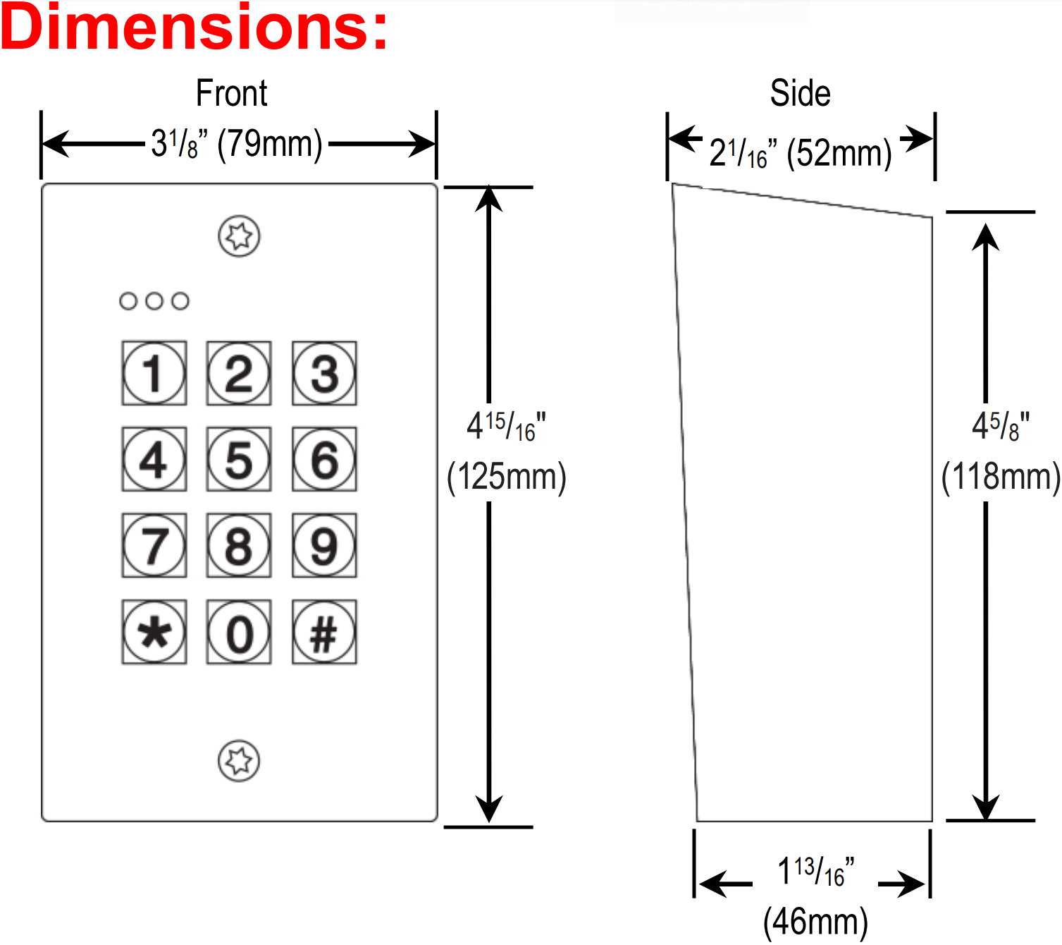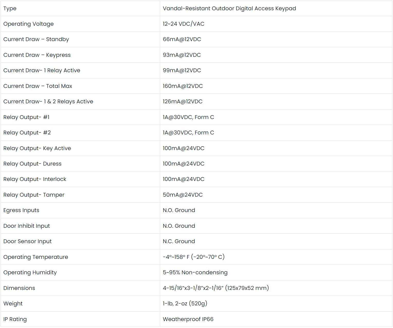 The Seco-Larm SEA SK-1123-SDQ Keypad allows for 1,100 users over 2 outputs with codes being 4~8 digits. Output #1 is a Form C relay that runs at 1A@30VDC and can hold 1,000 users while output #2 is also a Form C relay that runs at 1A@30VDC but only holds 100 users. The outputs can be programmed to activate for up to 99,999 seconds (nearly 28 hours). There are super user codes that give admins access to keypad. It is also able to have up to 50 (01~50) possible temporary visitor codes, which can be programmed for one-time or limited-time use (1~99 hours). It can have up to 50 (01~50) duress/egress codes for output #1 and 10 (01~10) for output #2 that signals a silent alarm if an authorized user is forced to open the door under duress. It can also have an optional warning alarm and delayed egress. It includes a Real-time clock to auto-disable access at specific times. Comes with a mantrap function for a protected area with two doors, this feature allows only one door to be open at a time. All of this is programmed directly from the keypad: No need for an external programmer. The keypad illuminates when a button is pressed and the backlight can be programmed for FULL, AUTO, or OFF in standby mode. The Seco-Larm SEA SK-1123-SDQ Keypad is IP66 Weatherproof Rated and has a durable and attractive stainless steel faceplate. It can run on 12~24 VDC/VAC with auto-adjusting operation and has a tamper output with N.C. Dry contact that runs at 50mA@24VDC max. It mounts to a standard single-gang back box (surface-mount back box included). It has a door sensor input for anti-tailgating operation, door-propped-open warning, and door-forced-open warning. EEPROM Memory protects programmed information in case of power loss