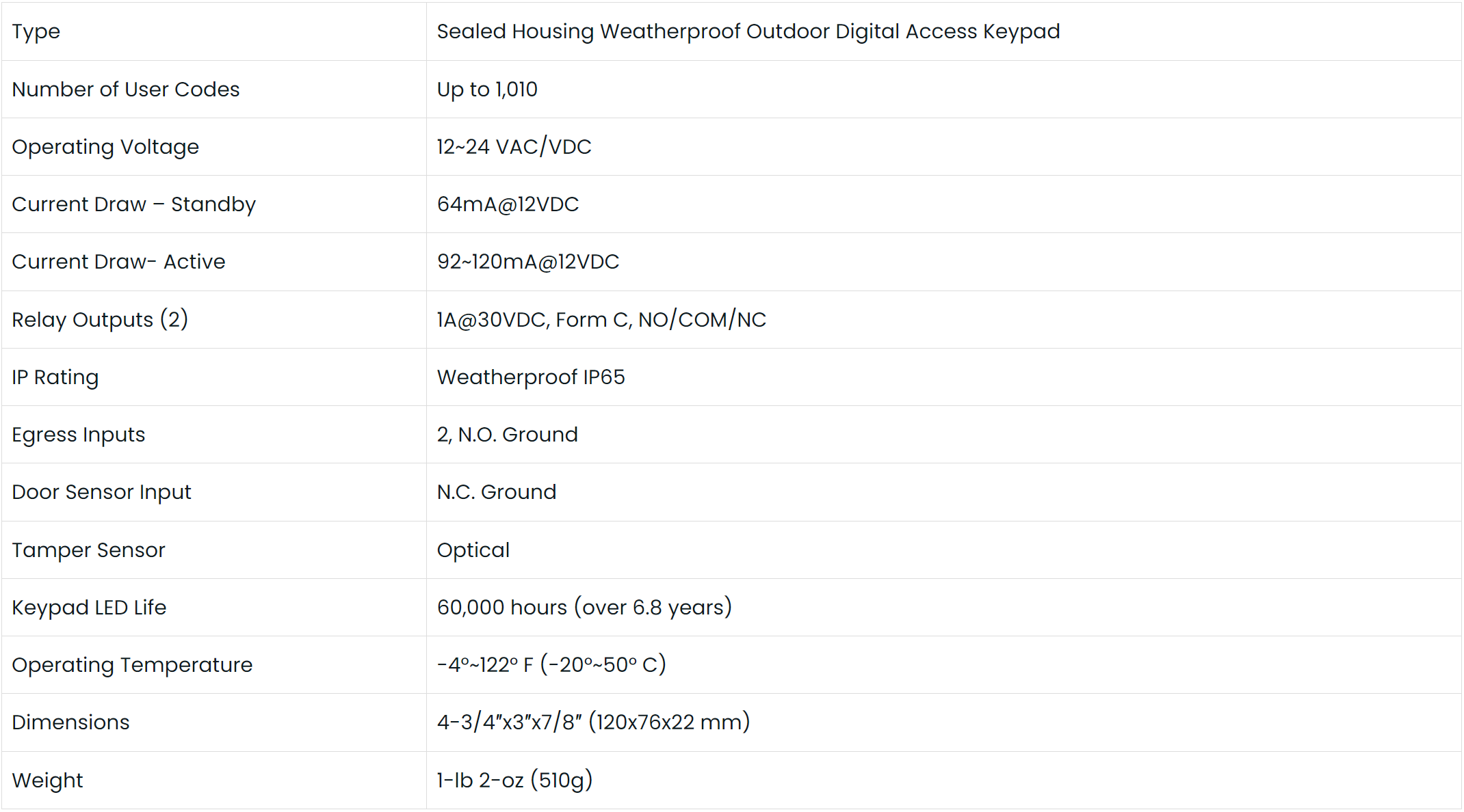 The Seco-Larm SK-1323-SDQ Keypad can have 1,010 Users (Output #1: 1,000 users, Output #2: 10 users) with 2 Form C relays, each rated 1 Amp @ 30VDC. Each relay has a programmable output time from 1~99 seconds or toggle. Output #2 can be programmed for use with a doorbell. It comes with 2 Egress inputs and 1 door sensor input. All of these features are programmed directly from the keypad so there is no need for an external programmer. It has backlit keys for easy nighttime use two multi-colored status LEDs. The Seco-Larm SK-1323-SDQ Keypad has an IP65 Weatherproof rating due to its rugged aluminum construction and circuitry being potted with epoxy for outdoor use. It can operate on 12~24 VAC/VDC. EEPROM memory protects programmed information in case of power loss as well as an optical tamper for added security. It is able to mount to a single-gang back box.