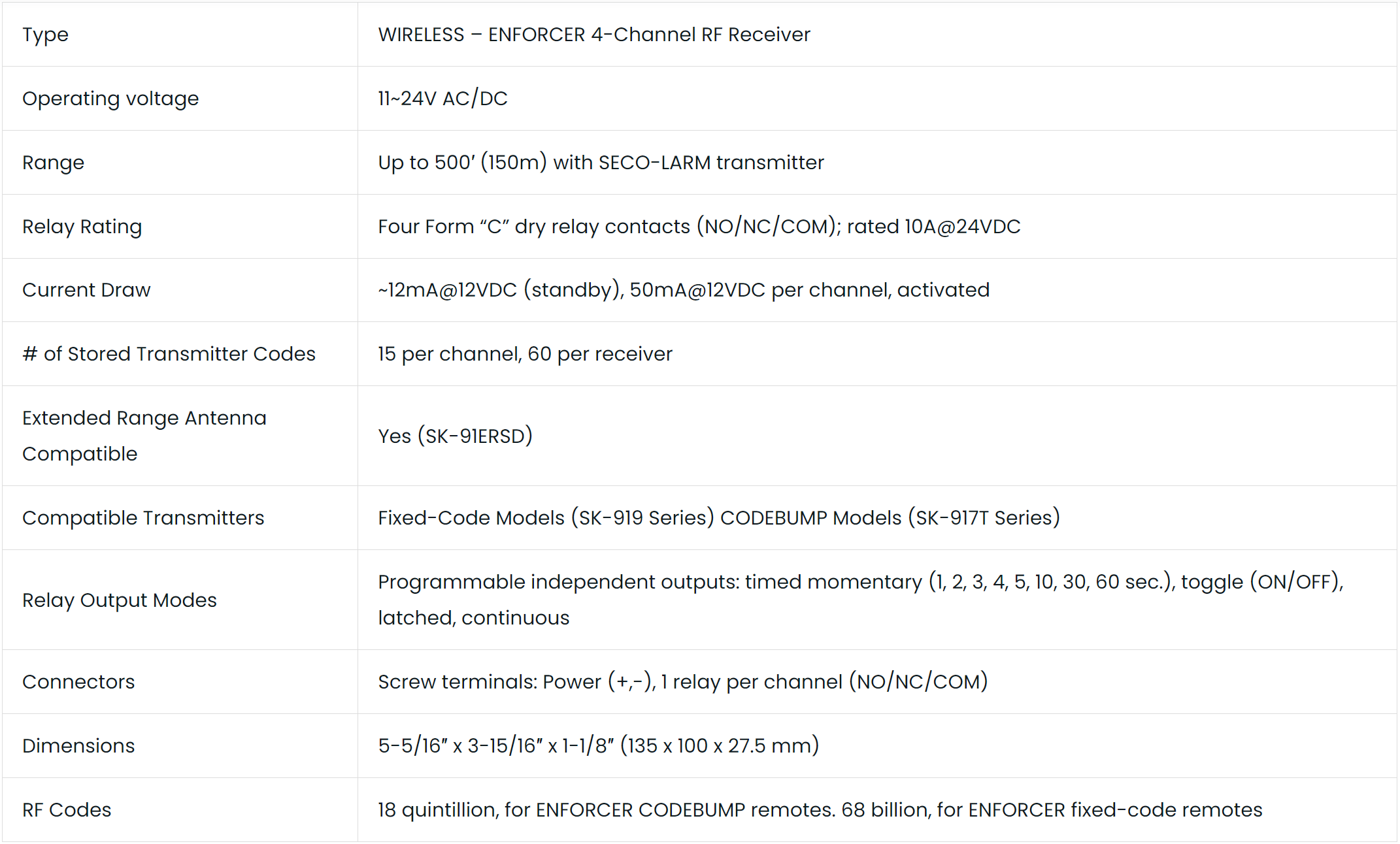 The SK-910R4Q are wireless receivers that meet the growing demand for multi-channel receivers with multiple and independently controlled output modes. RF receivers can be used to control a variety of home automation devices such as garage door openers, lights, motorized gates, lifts, or other devices remotely. These receivers are compatible with both fixed code and code hopping transmitters. Code hopping transmitters, such as SECO-LARM CODEBUMP™ transmitters, change codes every time transmitter sends a signal for extra security.