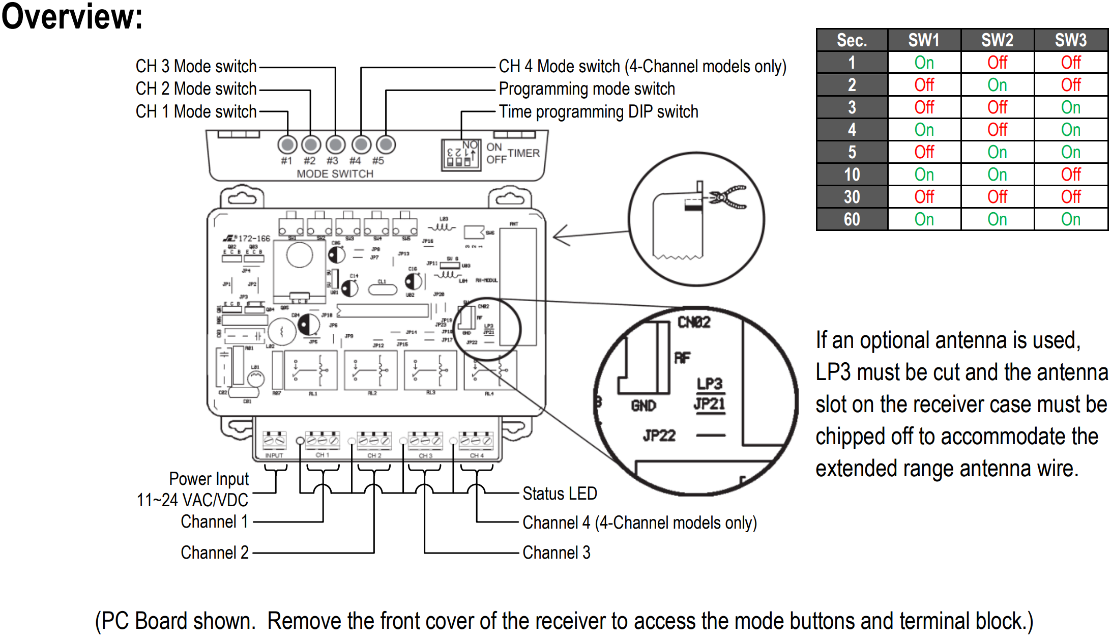 - LED indicates RF reception, learn mode entered, transmitter learned, memory cleared, and relay output mode