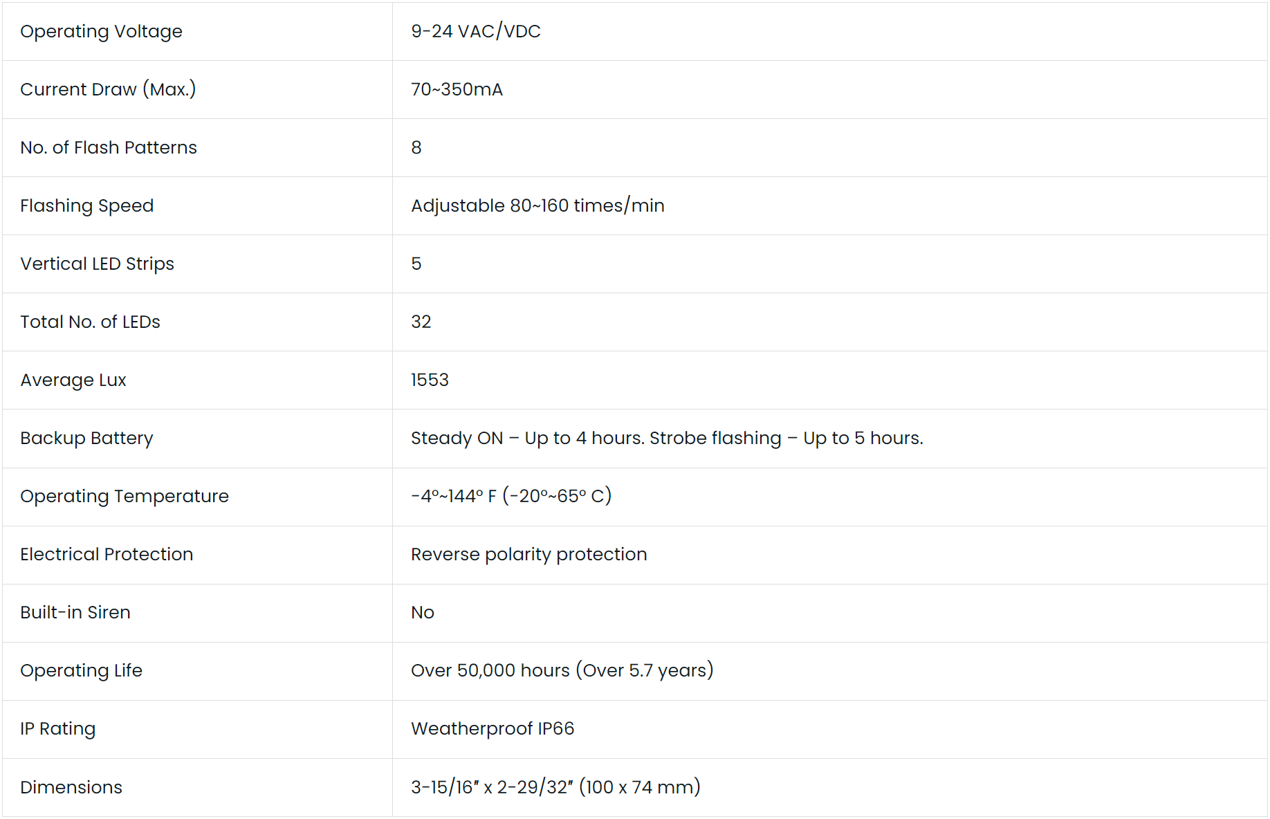 - 5 Vertical LED strips (32 LEDs) increase visibility from various directions