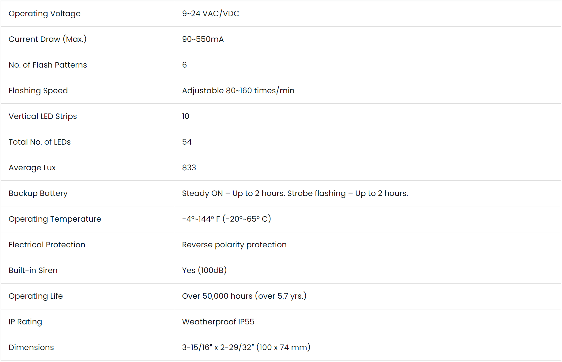 - 10 Vertical LED strips (54 LEDs) increase visibility from various directions.