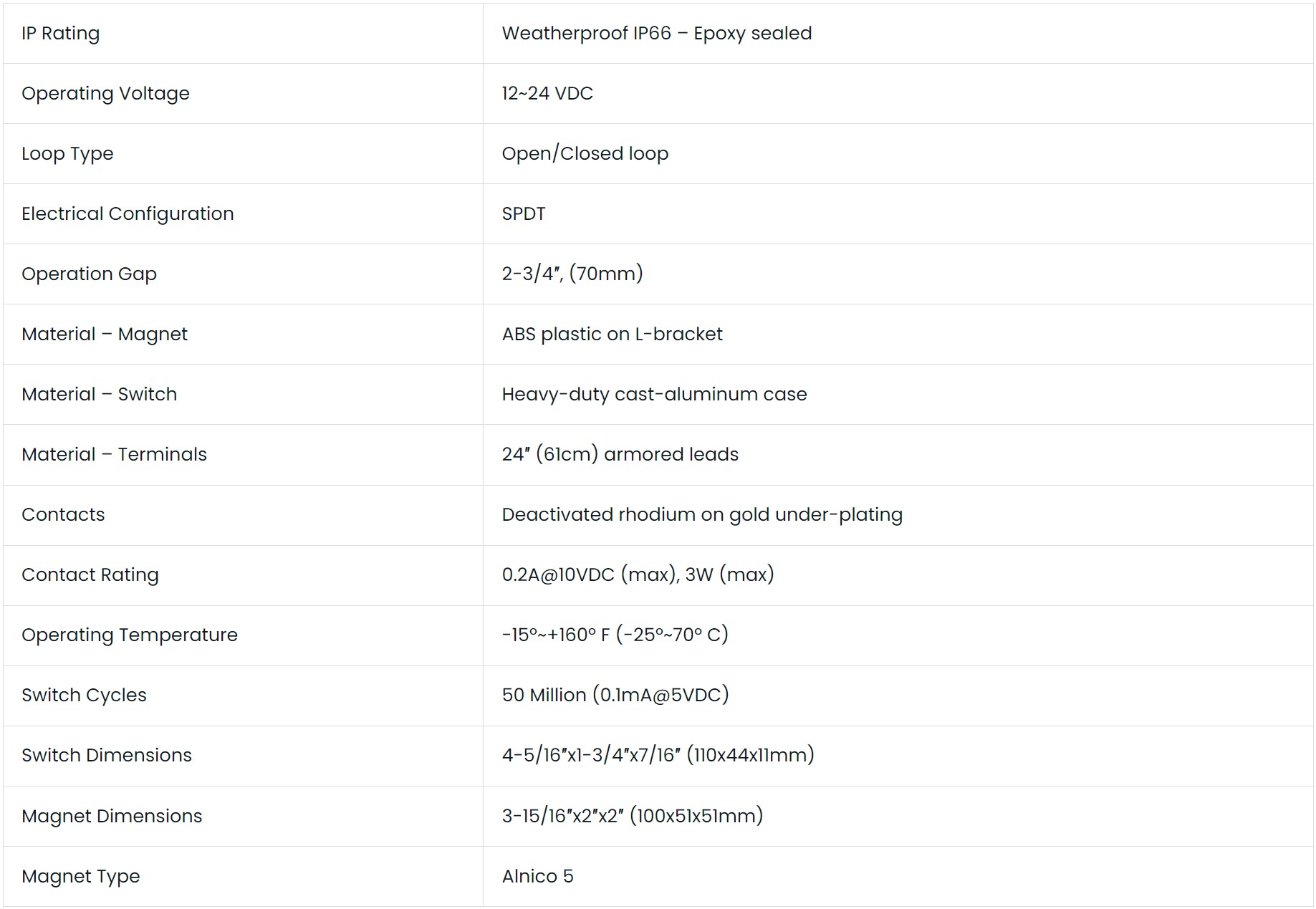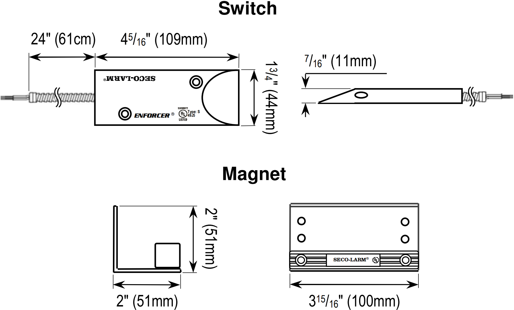 The Seco-Larm SM-226L-3Q Magnetic Contact can be adjusted to fit most door-channel widths and is meant for open or closed-loop circuits. It comes with a 24″ (61cm) Armored wire leads and has a 2-3/4″ (70mm) Gap for overhead doors. It has a weatherproof IP66 rating and is epoxy sealed for weatherproof installation. The reed switch has deactivated rhodium on gold underplating. The Seco-Larm SM-226L-3Q Magnetic Contact has an operating voltage of 12~24 VDC. The mounting bracket is included.