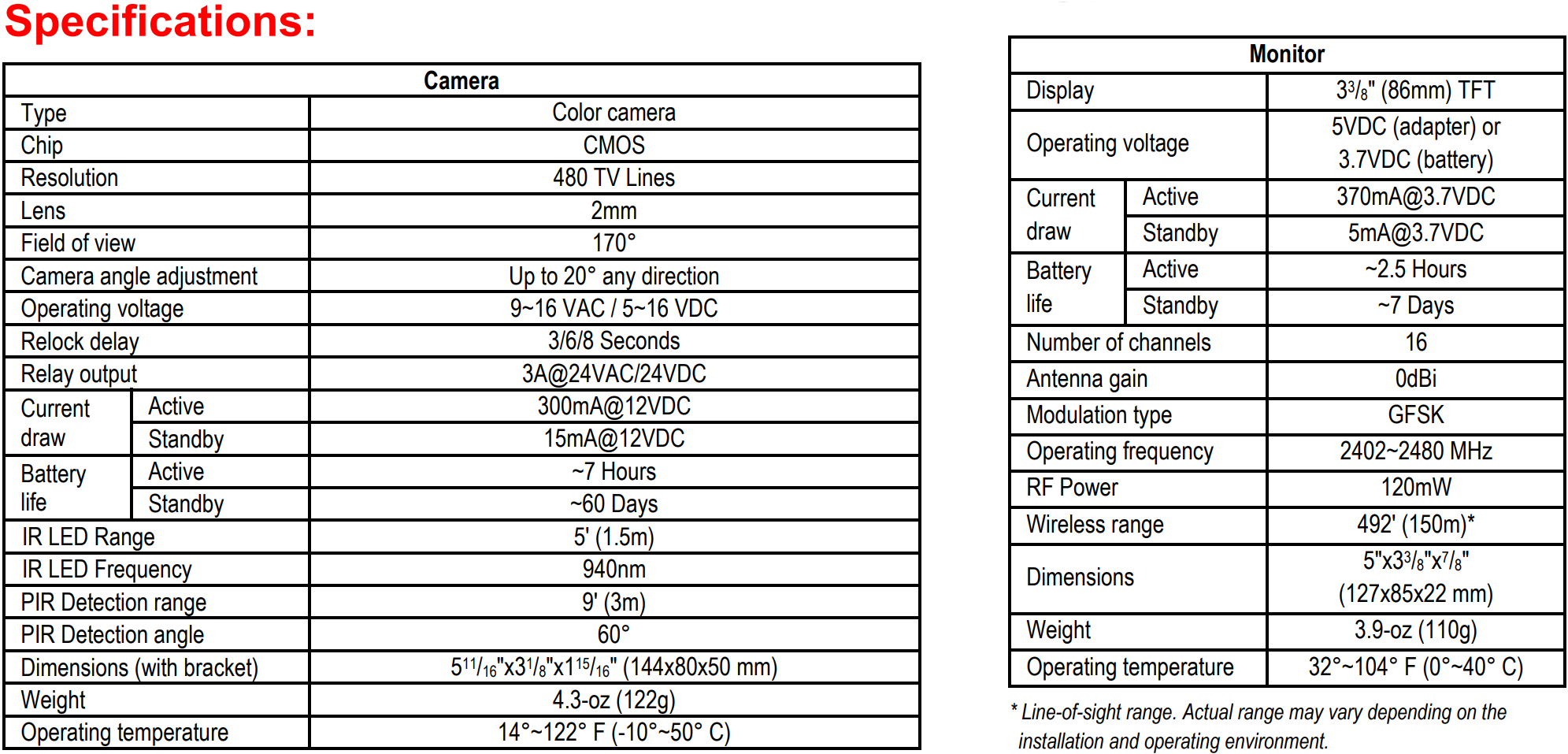 The Enforcer Wireless Video Door Phone is a convenient and secure way to monitor and control an entryway, such as a door or gate, from up to 492 feet (150 meters) away. When a guest or visitor presses the doorbell button on the camera unit, the homeowner can use one of up to three lightweight, wireless LCD monitors to see whom is requesting entry, speak with the caller, take a photo, and decide whether or not to grant entry. The video door phone can be expanded with up to two additional monitors and one additional camera. If multiple monitors are set up, then the system can also be used as an intercom system between each monitor