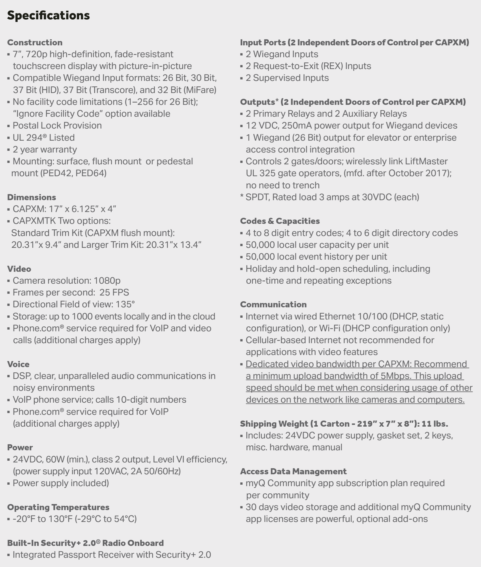 Cause una excelente primera impresión con el videoportero inteligente CAPXM, una solución escalable basada en la nube que permite controlar hasta dos puntos de acceso: puertas o portones vehiculares. Controle múltiples puntos de acceso desde un único panel con la aplicación myQ® Community, que permite a los residentes ver quién está en la entrada antes de permitir el acceso gracias a una cámara de video integrada con visión de 135°.