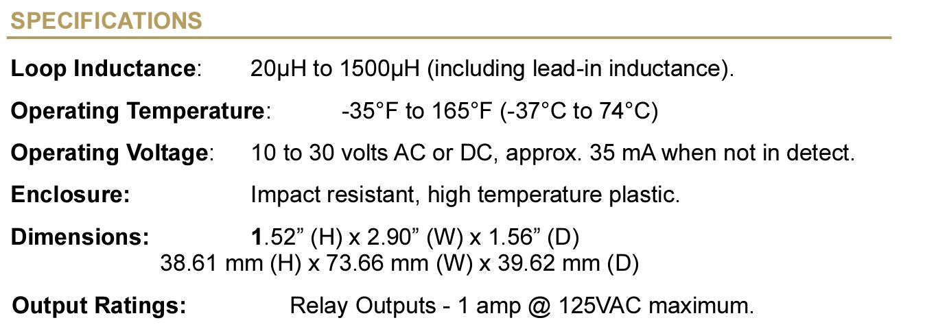 • Diseñado para estar libre de interferencias entre otros detectores de bucles similares.