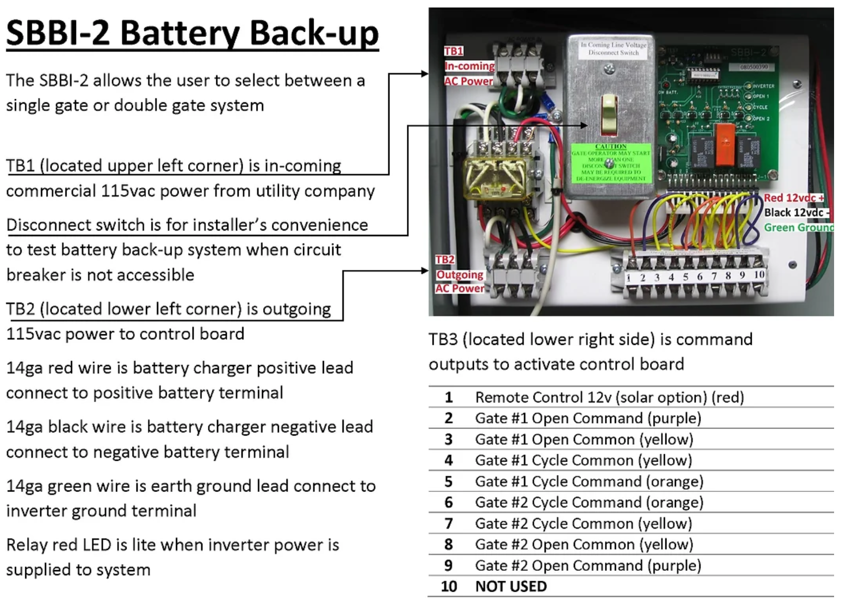 La batería de respaldo superior SBBI de BYAN SYSTEMS es la solución ideal para cortes de energía intermitentes. Mantiene la batería de su portón completamente cargada automáticamente. Esta batería de respaldo es capaz de operar un sistema de portón simple (con uno o dos operadores) o un sistema de portón doble (con dos o cuatro operadores). Consume menos de 10 amperios por panel de control. Con un panel adicional opcional, el SBBI puede cargarse con energía solar. El sistema utiliza una conexión a tierra que cumple con el NEC.