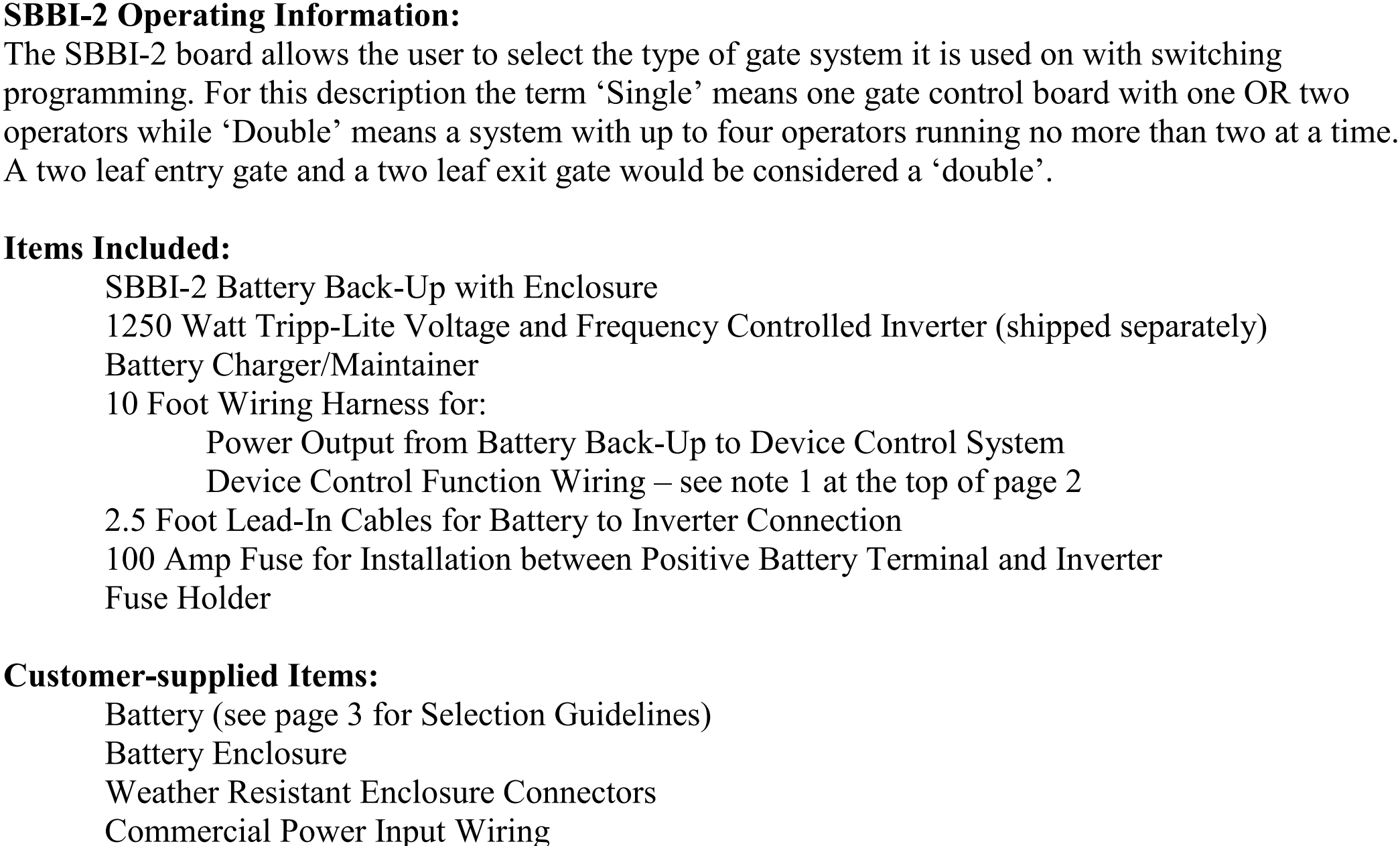 - Esta batería de respaldo es capaz de hacer funcionar un sistema de puerta simple (utilizando uno o dos operadores) o un sistema de puerta doble (utilizando dos o cuatro operadores).