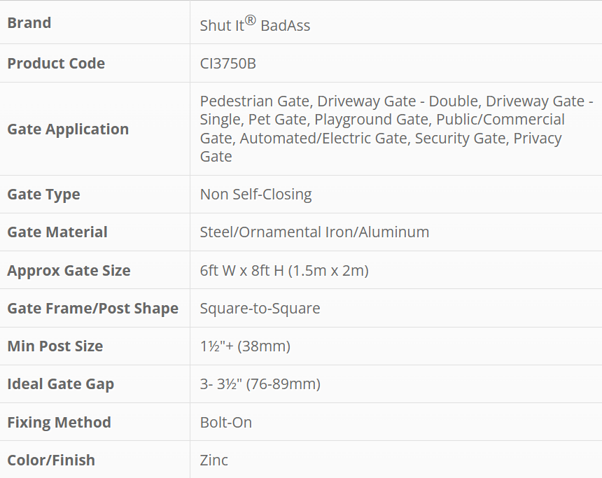 Las bisagras atornillables Shut It™ con recubrimiento en polvo negro tienen un acabado negro mate con protección UV para facilitar y agilizar la instalación. Los componentes principales están recubiertos individualmente para una cobertura completa, y las arandelas, la tuerca y el perno tienen un acabado de óxido negro a juego. Todas ofrecen un ajuste horizontal de 12 mm (½") y se fijan a postes de cercas y marcos de puertas con pernos pasantes. Fabricadas con rodamientos de bolas sellados que no requieren mantenimiento y probadas para más de un millón de ciclos de apertura y cierre, estas bisagras están diseñadas para durar. La bisagra atornillable Baby BadAss fue diseñada para usarse en puertas pequeñas donde no es posible soldar las bisagras a la puerta y al poste final. Las bisagras atornillables BadAss ofrecen un movimiento prácticamente sin fricción y no requieren mantenimiento.