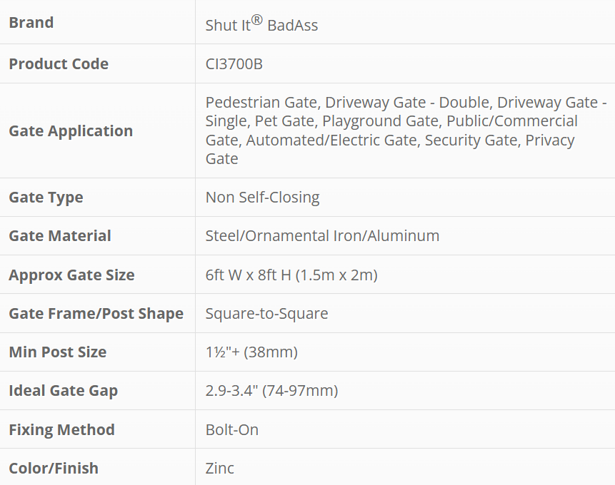 Las bisagras atornillables Shut It™ con recubrimiento en polvo negro tienen un acabado negro mate con protección UV para facilitar y agilizar la instalación. Los componentes principales están recubiertos individualmente para una cobertura completa, y las arandelas, la tuerca y el perno tienen un acabado de óxido negro a juego. Todas ofrecen un ajuste horizontal de 12 mm (½") y se fijan a postes de cercas y marcos de puertas con pernos pasantes. Fabricadas con rodamientos de bolas sellados que no requieren mantenimiento y probadas con más de un millón de ciclos de apertura y cierre, estas bisagras están diseñadas para durar. La bisagra atornillable BadAss está diseñada para puertas de hasta 450 kg (1000 lb). Mecanizada en CNC con las tolerancias más estrictas de la industria, produce un movimiento prácticamente sin fricción y sin necesidad de mantenimiento.