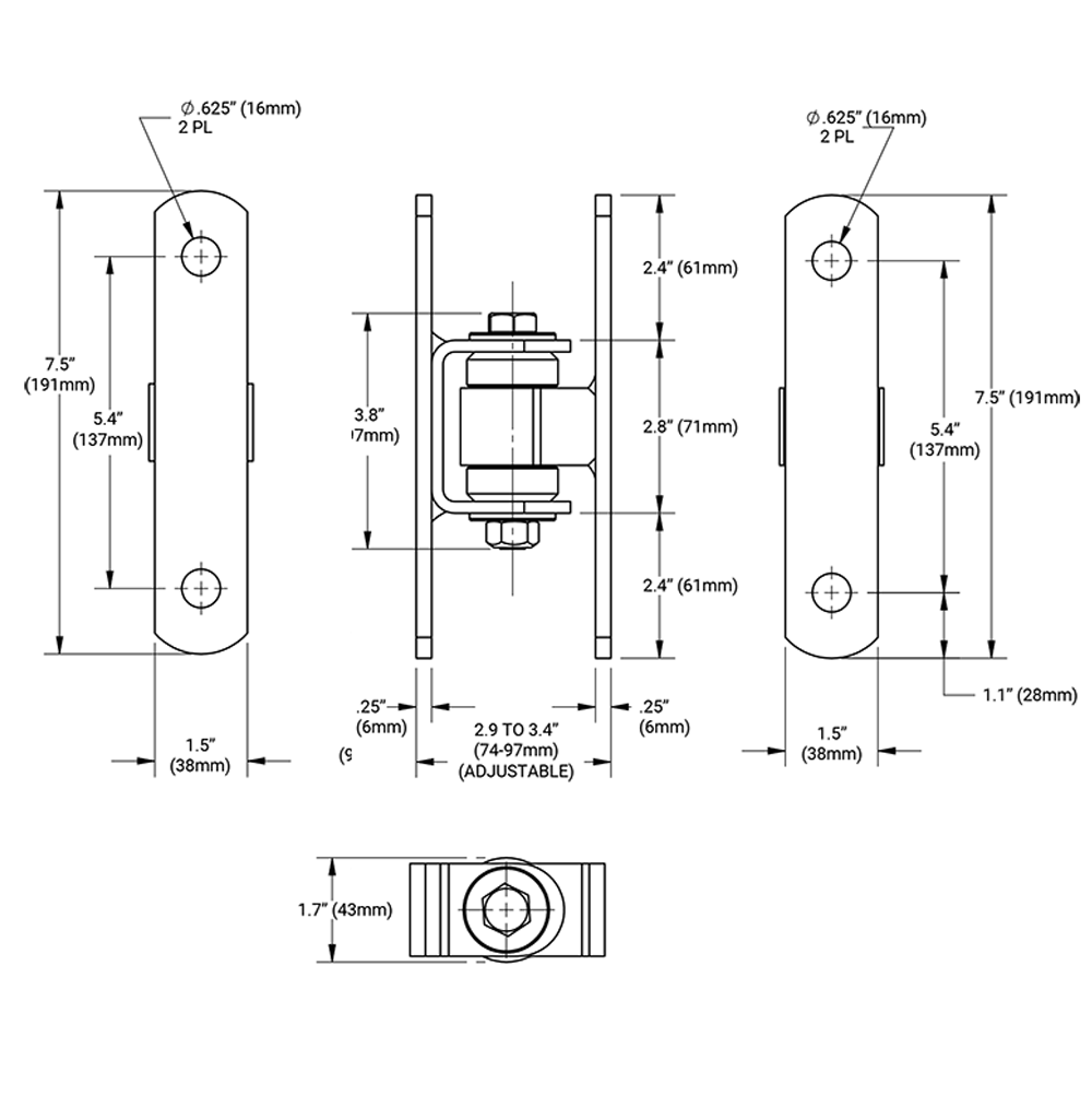 El Bolt-On BadAss fue diseñado para usarse en portones donde no es posible soldar las bisagras a la puerta ni al poste final. Gracias al exclusivo diseño de buje de SHUT IT, los Bolt-On BadAsses, al igual que todas las demás bisagras de portones SHUT IT, ofrecen un movimiento prácticamente sin fricción y no requieren mantenimiento.