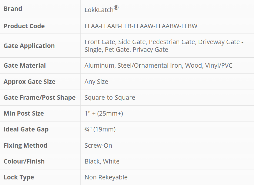LokkLatch® REGULAR es el pestillo multiusos ideal para puertas de casas, jardines y patios. Adopta un enfoque radicalmente nuevo del principio de "pestillo de gravedad" y combina las ventajas de la cerradura con llave y un cierre fiable con un diseño superior y componentes duraderos. El LokkLatch está fabricado con polímeros ultrarresistentes y resistentes a la corrosión, y componentes de acero inoxidable que no se oxidan ni corroen, lo que lo hace robusto y fiable. Las patas de fijación lateral facilitan la alineación y una fijación más firme. El LokkLatch® REGULAR también ofrece ajuste vertical y horizontal para garantizar un ajuste preciso y un funcionamiento fiable. Se puede instalar en todas las puertas de postes cuadrados y se adapta a puertas batientes de izquierda o derecha. Hay disponible un kit de acceso externo opcional (pulsador) para accionar el pestillo (mediante una biela) desde ambos lados de la puerta.
