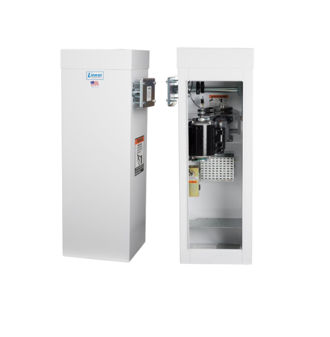Operador de barrera lineal Osco BGU-14-311 de 1/3 HP, 115 V, monofásico, para control de tráfico y estacionamiento. Diseñado para servicio continuo con un brazo de madera de 4,2 m (14') y una velocidad de apertura de 2,5 segundos.