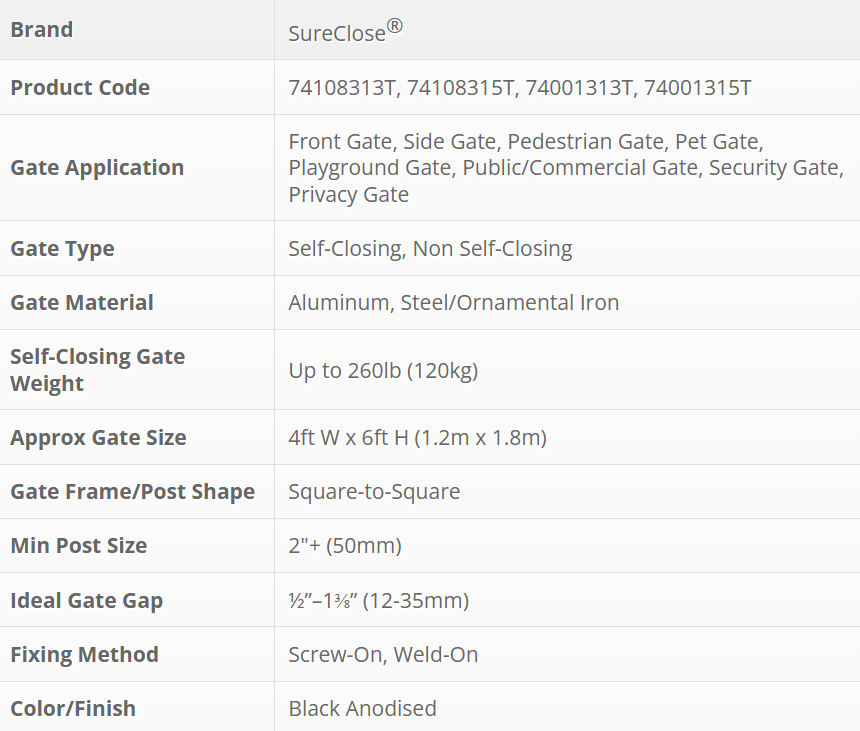 Los cierrapuertas y bisagras hidráulicos SureClose® están diseñados para reemplazar las bisagras y cierrapuertas comerciales convencionales y voluminosos. Estos cierrapuertas, robustos y resistentes, ofrecen un funcionamiento suave y sin atascamientos. Su ingeniería superior y diseño patentado permiten una ingeniosa ocultación del sistema hidráulico en una carcasa increíblemente compacta. La calidad de estos cierrapuertas y bisagras SureClose® de tamaño compacto no se ve comprometida. Cada modelo "ReadyFit" hace honor a su nombre al ofrecer prácticas ranuras y orificios para tornillos para una fijación robusta. Se suministran tornillos Tek autoperforantes de 25 mm x 12 g. Las ranuras permiten un ajuste vertical preciso para una rápida alineación de la puerta. El ajuste horizontal se logra mediante un anillo de bloqueo ajustable integrado que gira hacia adentro o hacia afuera según sea necesario para garantizar la nivelación de la puerta y una alineación general. Es extraordinariamente sencillo para un cierrapuertas de estilo comercial. Todas las bisagras y cierrapuertas SureClose® están fabricados en aluminio de alta calidad. Los soportes de montaje de acero en forma de L opcionales se pueden soldar o fijar a los marcos y postes de la puerta correspondientes.