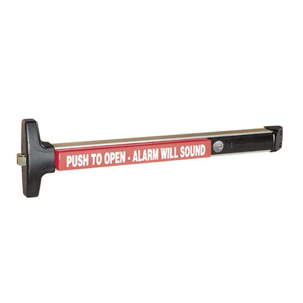 Barra de salida de emergencia reversible de 36" con alarma, mecanismo de cierre de acero inoxidable y cubierta de ABS negra. La alarma tiene una intensidad de aproximadamente 100 dB y funciona con una batería de 9 V.