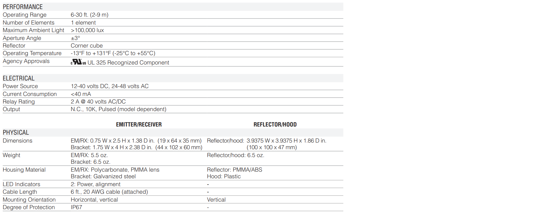 El sistema fotoóptico reflectante monitoreado Miller Edge TruGuard combina un emisor y un receptor en la misma carcasa. El reflector, equipado con una cubierta para mayor inmunidad a la luz solar, devuelve el haz fotoóptico a la unidad emisora/receptora. Este sistema funciona como una barrera protectora que protege una zona de peligro o atrapamiento. Cuando una obstrucción interrumpe la barrera invisible, se envía una señal a los controles del motor para detener o revertir el movimiento. Un haz de luz visible facilita la alineación con el reflector, facilitando su instalación.