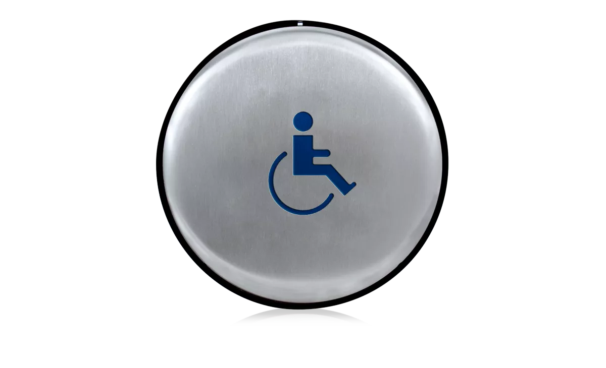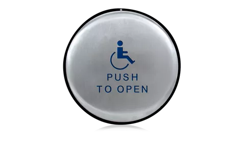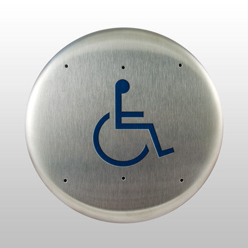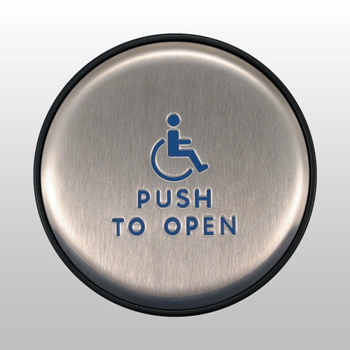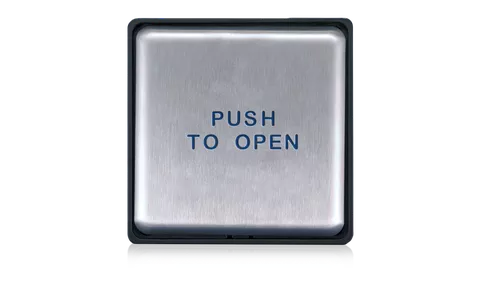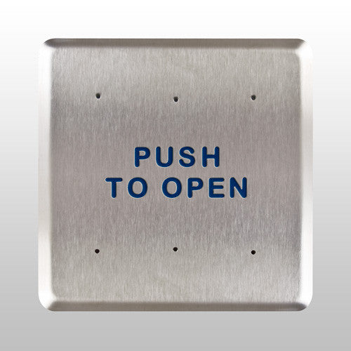 Placa de empuje cuadrada de 4,75" inalámbrica y resistente al agua con logotipo y texto "presionar para abrir".