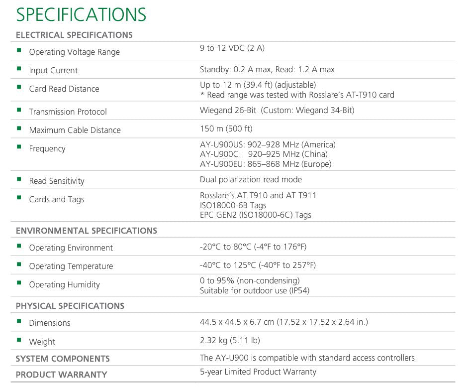 El AY-U900 es un lector UHF compatible con múltiples protocolos y capaz de leer múltiples formatos de etiquetas. Es resistente al agua y apto para una amplia gama de aplicaciones RFID, como la gestión del transporte, la gestión de vehículos, el aparcamiento, el control de procesos de producción y el control de acceso.