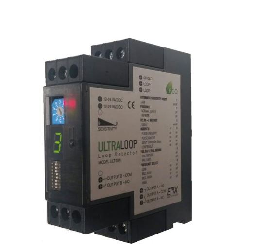 El detector de bucle vehicular ULT-DIN permite la detección de objetos metálicos que entran en el campo alrededor de un bucle de inducción. Este detector de vehículos puede utilizarse en las posiciones central, inversa y de salida del bucle. La pantalla ULTRAMETER™ facilita la configuración, mostrando la sensibilidad óptima necesaria para detectar un vehículo cerca del bucle. Diez ajustes de sensibilidad permiten un ajuste preciso del nivel de detección. El ULT-DIN proporciona salidas de contacto de relé que indican la presencia del vehículo y un segundo conjunto de salidas de contacto de relé que proporcionan funciones auxiliares. La segunda salida puede utilizarse para detectar fallos de bucle, pulsos de entrada/salida o la función exclusiva de EMX Detect-on-Stop™ (DOS®). El ULT-DIN cuenta con