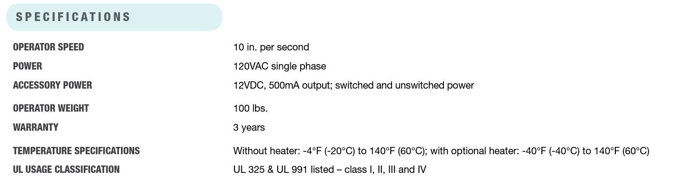 - 1/2 HP clasificado para puertas de 50 pies y 1000 libras. 1 HP clasificado para puertas de 50 pies y 2000 libras.