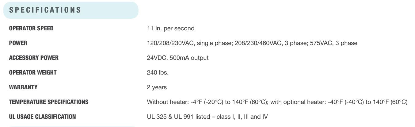 - Probado según las más estrictas normas de la industria UL 325. Es necesario añadir dispositivos de retención secundarios para cumplir con la norma UL 325. Su instalador le recomendará los dispositivos de retención secundarios adecuados para su instalación, como fotocélulas o sensores de borde.