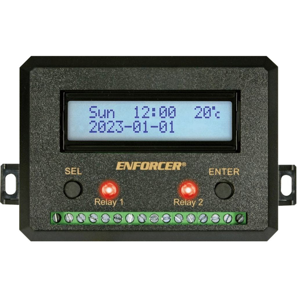 El temporizador anual Enforcer SA-027HQ puede programarse para operar dos relés de formato C las 24 horas del día, durante todo un año, para diversas aplicaciones, como seguridad, control de acceso, iluminación y control ambiental. Cada relé puede programarse para hasta 99 eventos, cada uno con una programación semanal o diaria. La programación por bloques permite que los eventos se repitan en días consecutivos. Veinte días festivos programables desactivan el temporizador durante un solo día o el mismo día del año.