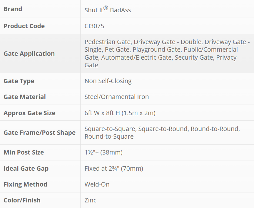 La VersaWeld de BadAss: una bisagra sencilla que se suelda a prácticamente cualquier portón desde el primer momento. Mecanizada en CNC con las tolerancias más estrictas de la industria. Gracias al diseño único de buje de SHUT IT, la ORIGINAL, al igual que todas las demás bisagras para portones de SHUT IT, ofrece un movimiento prácticamente sin fricción y no requiere mantenimiento.