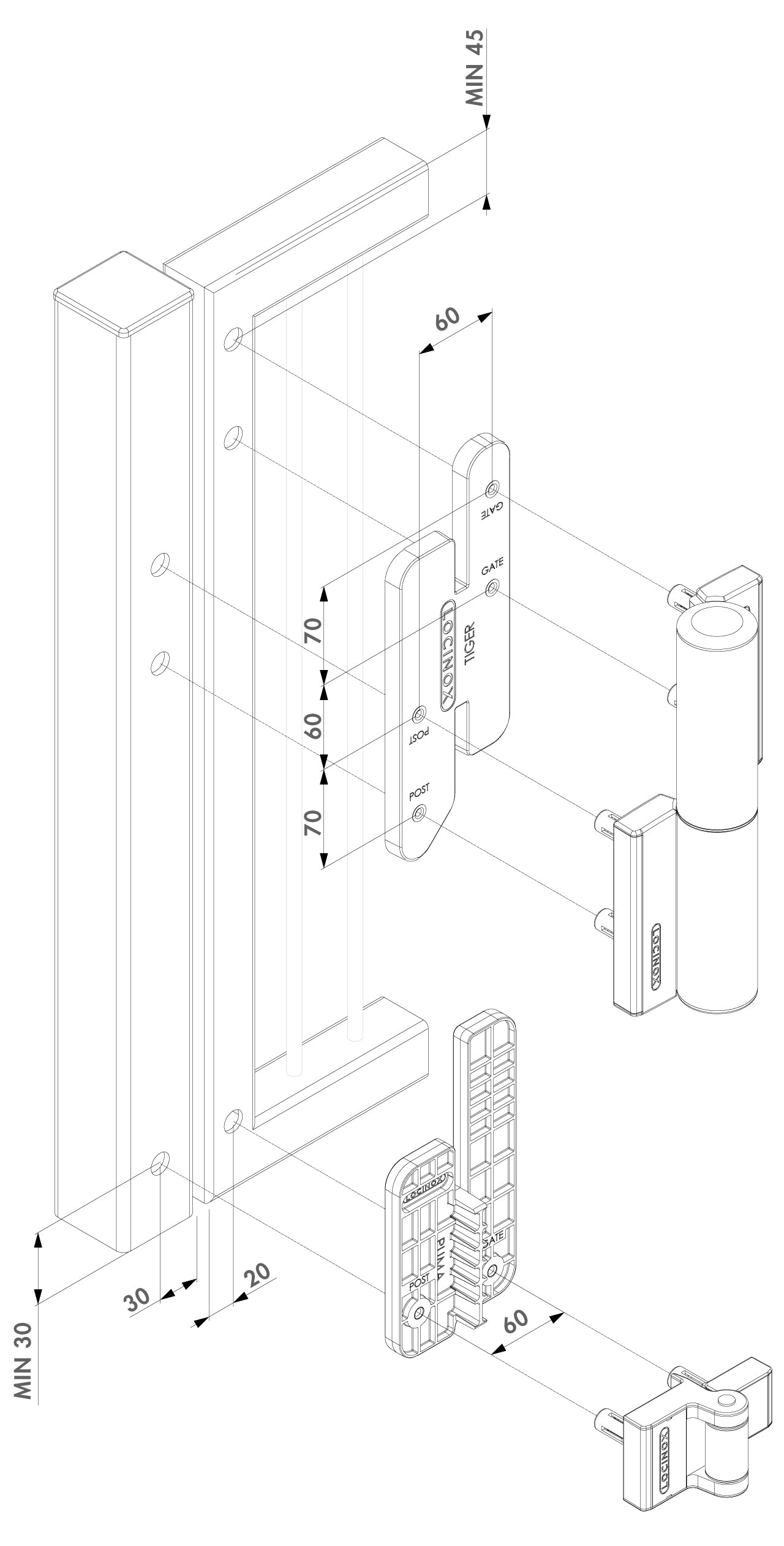 Tool case with installation and drilling jig to perfectly align and install the Tiger gate closer and its Puma hinge. This tool guarantees perfect alignment and a fast and easy installation. No measuring needed, just fix the tool on the post, drill the holes, install the Tiger and Puma, and close the gate.